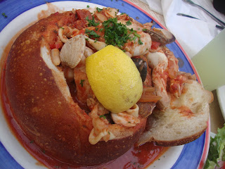 A especialidade é o Cioppino, espécie de ensopado de peixe e frutos do mar, que pode ser servido num prato fundo como uma sopa ou dentro de um maravilhoso pão, parecido com um pão italiano redondo, chamado Sourdough Bread, tem muito na Califórnia. A verdade é que as opções são muitas e as porções são imensas. Para ter idéia: tem um balcão só com embalagens descartáveis de todos os tamanhos e com todos os “amarrilhos” necessários para pegar a vontade e levar para casa tudo o que sobrar.
